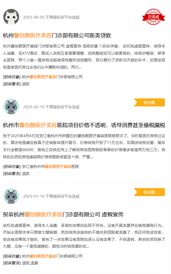 在黑猫投诉上,关于馨创颜医疗美容的医美贷款、违规收费、虚假宣传的投诉中,不乏与蔡女士有相似遭遇的受害者。