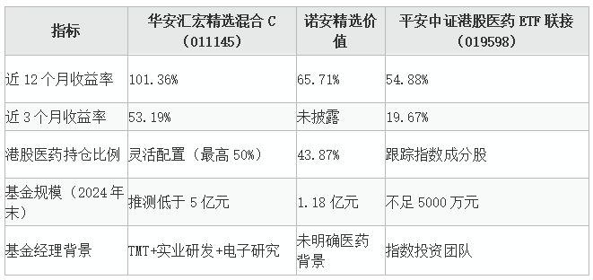 根据上述标准,最终筛选出3只核心标的:华安汇宏精选混合C(011145)、诺安精选价值(规模1.18亿元)、平安中证港股医药ETF联接(019598,规模不足5000万元)。