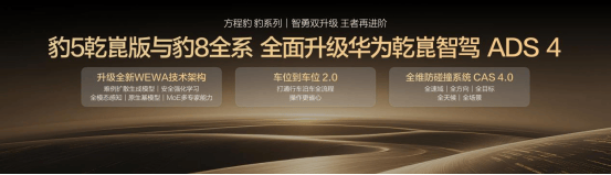 豹5乾崑版及豹8全系将升级华为乾崑智驾ADS 4,实现了从类人驾驶到超人驾驶的重大升级。首先,升级全新WEWA技术架构,让辅助驾驶可以云端自主学习进化,越用越丝滑;车位到车位功能也升级至2.0版本,打通了行车到泊车的全流程,全程衔接无缝,操作更省心;此外,还有全维防碰撞系统CAS 4.0,可以覆盖全路况、全天候,安全制动更快更灵敏,让长途驾驶不再疲惫,让城市通勤安全又轻松。