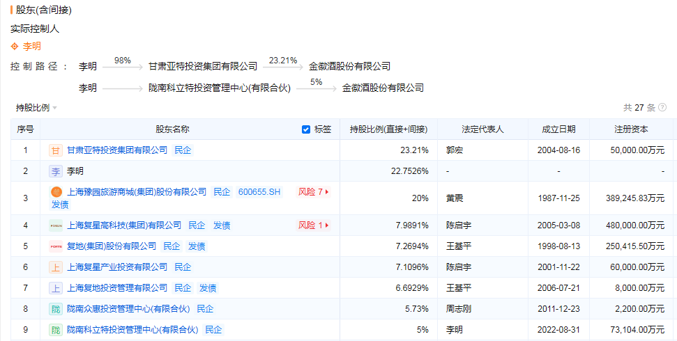 企业预警通数据显示,目前李明通过亚特投资和陇南科立特投资管理中心(有限合伙)对金徽酒合计持股约28.21%。金徽酒2024年财报显示,公司董事长、总裁周志刚,董事张世新,董事郭宏,监事会主席周世斌等均来自亚特集团。李明虽然不在金徽酒任职,但金徽酒的发展方向在李明的实控之内。