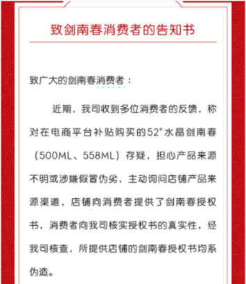 去年双11前后,剑南春发布了消费告知书,称各电商平台补贴的多个店铺销售的水晶剑南春疑似为回收拼凑销售,希望消费者谨慎购买官方渠道以外的产品。此举意在规范市场,打击企业销售体系外的违法违规行为。
