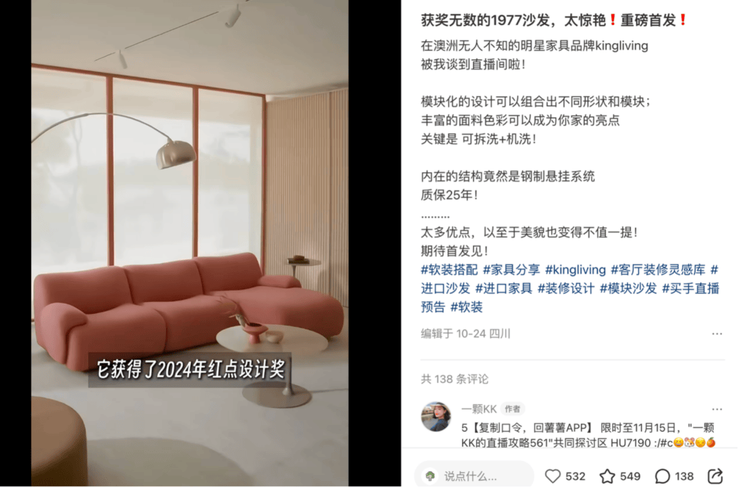 这两年是海外好品牌集中入驻小红书电商的阶段。在澳洲已有近50年历史的知名家具品牌KingLiving,选择小红书作为电商首站,今年7月开店,在双11则迎来高光时刻。据小红书相关数据显示,通过与专业家具买手合作,在直播间内斩获“单场布艺沙发细分品类第一”。好产品会说话的前提是能被看见,小红书电商的买手则充当着“好货发现官”的角色。同样在法国有上百年历史的帽饰品牌MOSSANT,进入中国电商市场,首选站亦是小红书。