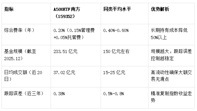 • A500ETF南方(159352)以0.20%的低费率、233亿元的规模、37亿元的日均成交额及0.38%的跟踪误差,构成“四优”竞争力;