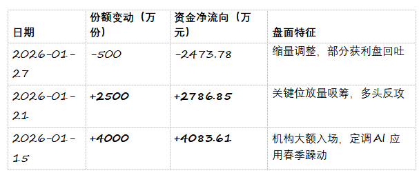 虽然1月27日份额减少了500万份,出现了约2473.78万元的净流出,但在近一个月涨幅近14%的背景下,这更倾向于高位获利盘的正常清洗。1月15日与21日合计超6800万元的大额净流入,构成了当前1.27元净值附近的坚实“底仓成本区”。