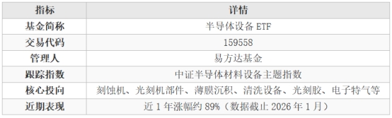 半导体设备ETF易方达(代码:159558)是由国内头部公募机构易方达基金(EFund) 管理的指数型基金。该基金紧密跟踪中证半导体材料设备主题指数(931743),旨在反映中国半导体设备与材料上市公司的整体表现。