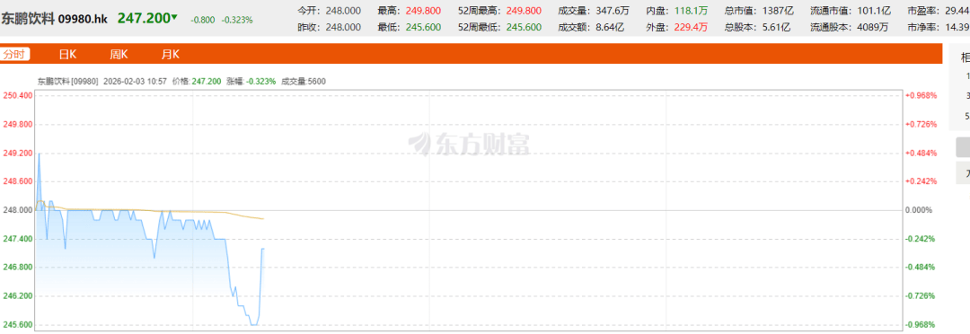 2月3日,市值千亿、有“A股功能饮料第一股”之称的东鹏饮料(9980.HK)在港交所挂牌交易上市,股价开盘反应平平。截至发稿前,最高股价仅249.8港元/股,最低则下探至245.6港元/股,较发行价248港元/股“平字当头”,总市值1387亿港元。