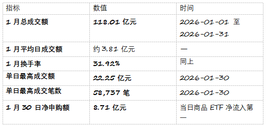 2026年1月,黄金基金ETF(518800)呈现高流动性、高活跃度特征: