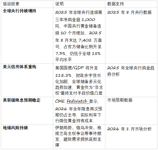 黄金价格的长期上行逻辑未被短期波动颠覆,核心支撑来自三大结构性力量:
