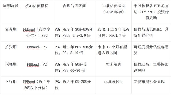 半导体设备ETF易方达(159558)的估值需结合周期动态判断,以下匹配表可科学评估其投资价值。