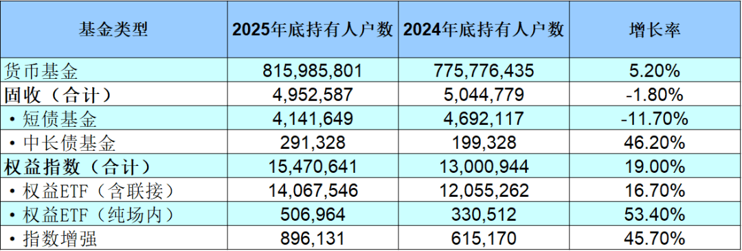 以天弘基金作为观测样本,2025年天弘旗下权益指数类产品(包含指数基金和指数增强基金)的持有人户数总体增长了19%,达到1547万户。其中,权益ETF(含联接)增长201.23万户,增幅16.7%;纯场内权益ETF增长53.4%,科技ETF、黄金ETF、红利ETF的持有人增长是该大类增长的核心动力。