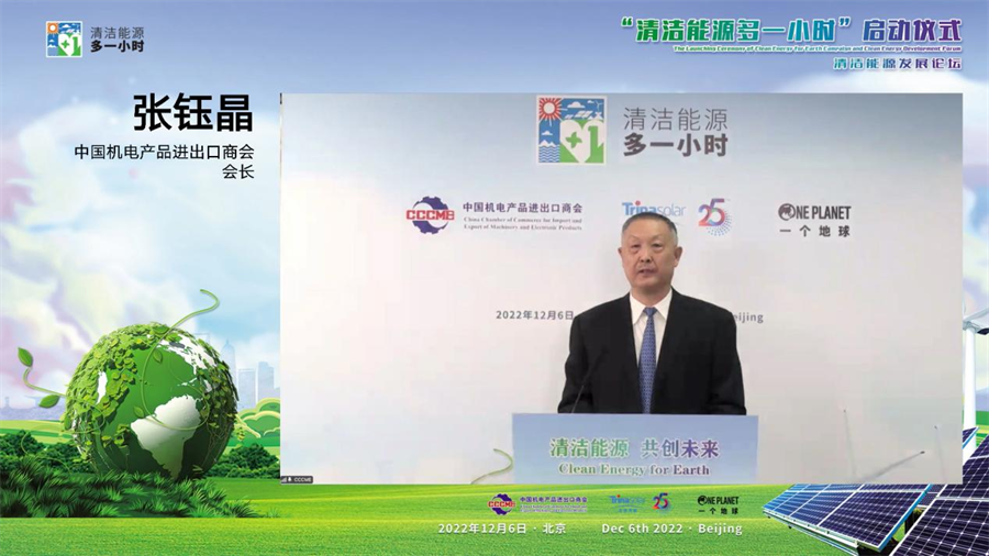 12月6日,由中国机电产品进出口商会(简称“中国机电商会”)、天合光能股份有限公司(简称“天合光能”)、深圳市一个地球自然基金会(OPF)共同主办的“清洁能源多一小时”启动仪式暨清洁能源发展论坛在北京举办。