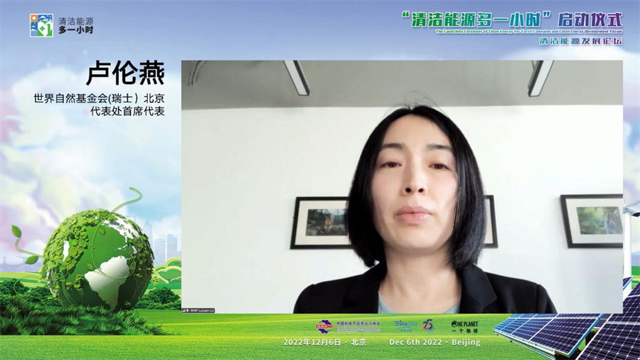 卢伦燕表示,清洁能源多一小时不只是一个人的一小时,而是14亿人的每人一小时。世界自然基金会呼吁人人支持参与和使用绿色能源,绿色电力,加入到清洁能源多一小时的行动中来,力争2030年中国的非水可再生能源装机量实现人人一千瓦目标。