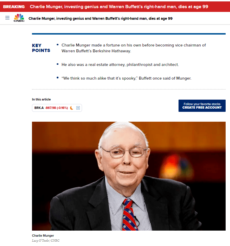 当地时间周二(11月28日),伯克希尔·哈撒韦在其子公司美国商业资讯网站上发布声明,投资天才、沃伦·巴菲特的得力助手查理·芒格去世,享年99岁。