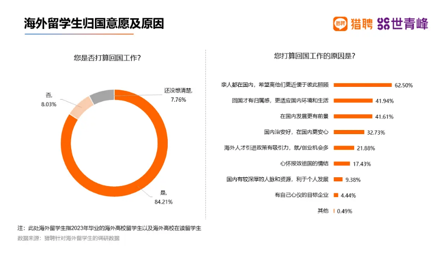 根据猎聘网《2023海外留学人才就业发展报告》的数据,在毕业后选择全职工作的海外留学生中,有84.21%的人计划回国就业。