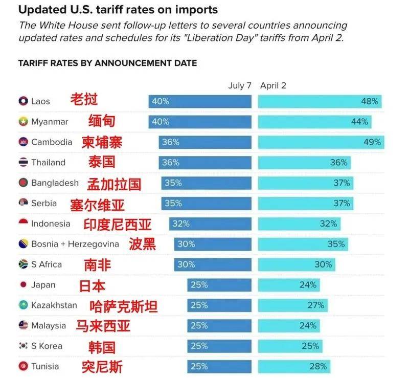 美国贸易代表办公室7月7日发布了一项震动全球市场的决定:自8月1日起,将对包括日本、韩国在内的14个国家进口商品加征25%至40%幅度不等的关税。与此同时,备受关注的“对等关税”谈判最终期限也被推迟至同一天——8月1日。