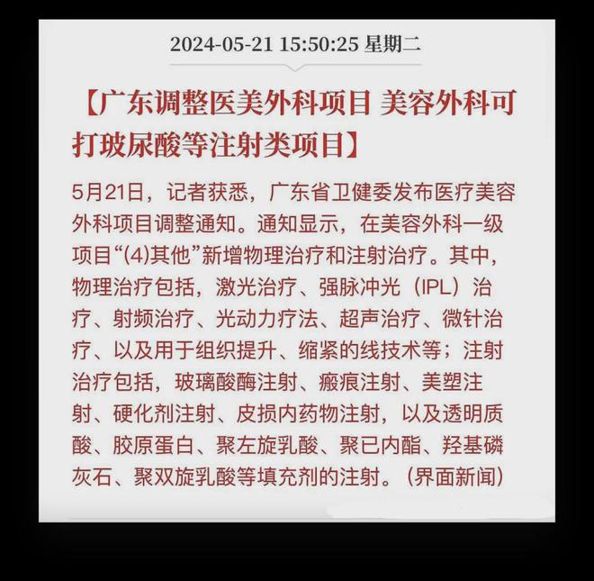 医美行业昨天出了个消息:广东调整医美外科项目,美容外科可打玻尿酸等注射类项目。