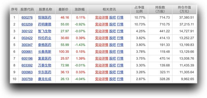 我们看到它的持仓是这样的,我们首先剃掉疫苗类,这里面智飞生物、万泰生物就不符合标准,为什么不看好疫苗,大家看我之前4月23日的视频。