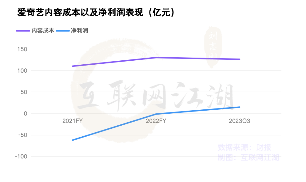 爱奇艺的内容成本一直都不低,根据财报,2021年爱奇艺的内容生产成本上升至110亿,2022年上升至130亿,2023Q3季度保持在126亿。