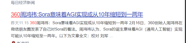 对于Sora,周鸿祎也在微信朋友圈发表了自己的看法,他认为Sora的诞生意味着AGI(通用人工智能)实现可能从10年缩短至一两年。