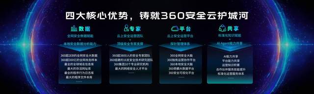 四大优势——通过对360集团全网安全数据及分析能力、顶级安全专家资源、探针管理体系、AI大模型及AI Agent等核心能力进行整合及共享,360安全云以360国家级安全能力赋能合作伙伴,省时省心省力地从0到1搭建起具备行业头部水准的联合运营中心,高效高质高能地向区域企事业单位输送安全运营服务。