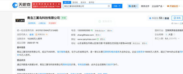 过去,海尔改名海尔智家,推出高端智能生态品牌三翼鸟,高端化、智能化两条腿走路,这些动作在传统家电行业算是比较成功的。天眼查APP信息显示,青岛三翼鸟科技公司2020年,海尔智能化转型,也不过几年的时间。