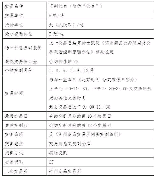 红枣期货合约与交割细则包含红枣期货交割方式、红枣期货交割单位、洪灾期货交割品级、红枣期货包装要求、红枣期货交割基准价、红枣期货交割地点、洪灾期货交割流程等内容。