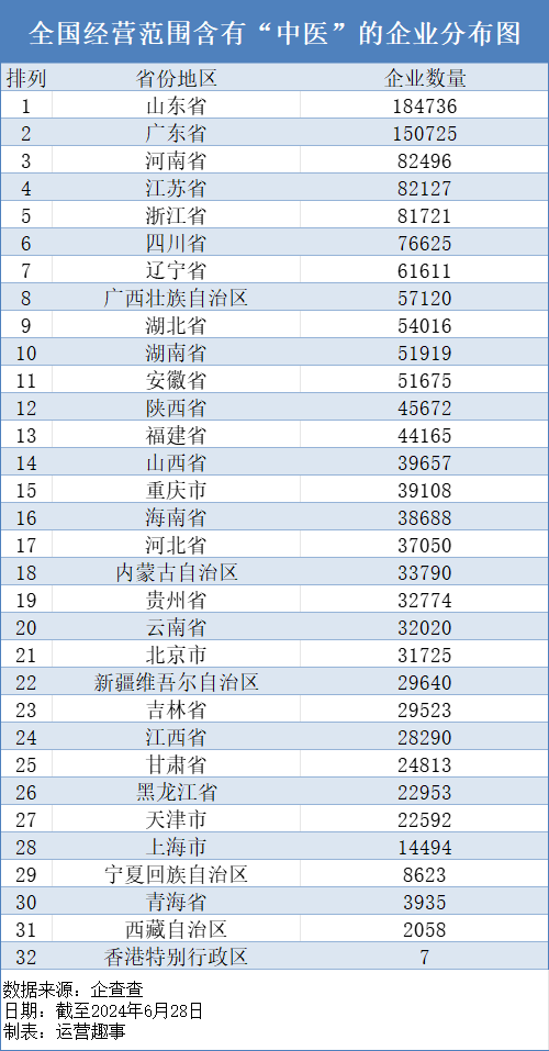 相关数据:全国目前约有150万家经营范围含有“中医”的企业,前三名的省份分别为山东省:184736家,广东省:150725家,河南省:82496家。通过国家统计局公开的数据,目前广东最近5年的人均预期寿命在全国各省市排名第六,达到79.31岁。