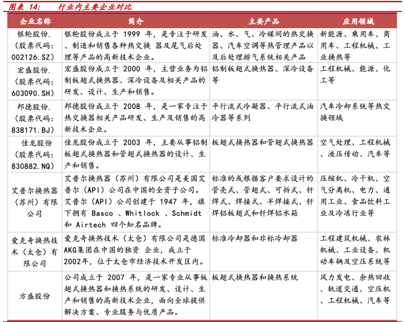 可比公司:银轮股份、宏盛股份、邦德股份。邦德股份:汽车冷却系统等热交换领域。银轮股份:新能源、乘用车、 商用车、工程机械、 工业换热等。宏盛股份:工程机械、能源、 化工等。宏盛股份也地处无锡。