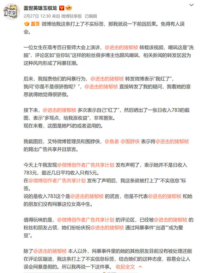 此外,四川德阳女医生被网暴自杀、刘学州被网暴自杀等事件,均在微博发酵扩散,引发极端后果。甚至就在近几天,湖南一位女高中生高考百日誓师的视频,也在微博上引发网暴行为。
