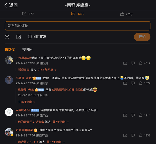 寻衅滋事罪的存废,是个法学问题。朱征夫多年呼吁取消寻衅滋事罪,则是在正当履行政协委员、人大代表的参政议政权利。然而让人意想不到的事,全国人大代表的正常履职行为,在微博上大量的网络暴力和谩骂随之而来。随便点开一条相关微博,网暴朱征夫的评论,点赞就达数万条。更甚有网友在热评中,希望把全国人大代表凌迟。