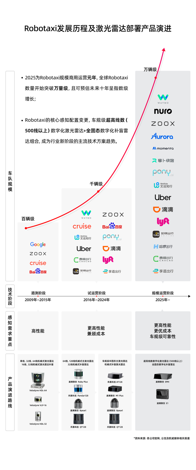 需求的剧变直接触发了供应链的洗牌。头部运营商为追求极致的运营安全与效率,纷纷在其新一代量产车型上切换方案。速腾聚创凭借EM4+E1的组合方案,已与全球超过90%的L4头部企业达成合作,并获得了滴滴、百度、小马智行、文远知行等多家企业的量产定点。相比之下,禾赛科技此前主推的64线及128线产品在性能上已显落后,其新一代高线数产品及全固态补盲雷达的量产进度面临挑战,在Robotaxi这一关键市场的增长潜力正被竞争对手锁定。
