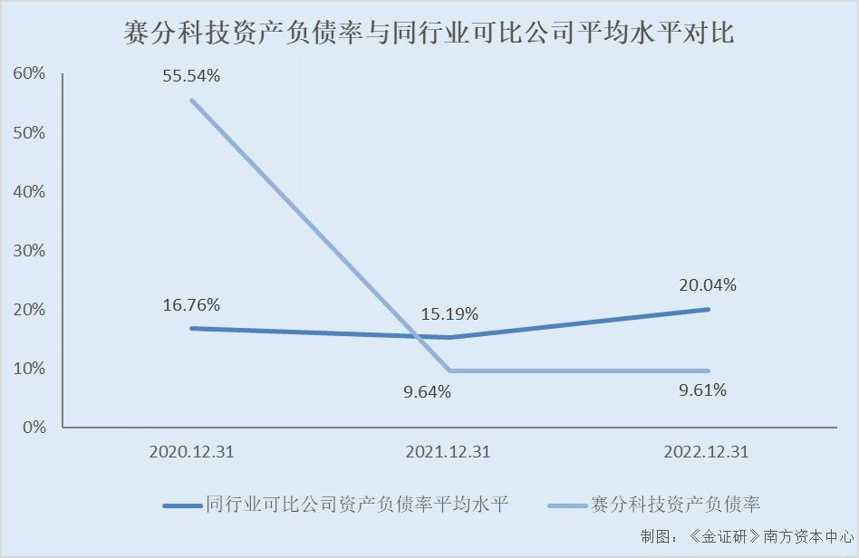 不难发现,在赛分科技进行股权融资以后,2021-2022年各年末,其资产负债率均在10%以下,且低于同行均值。