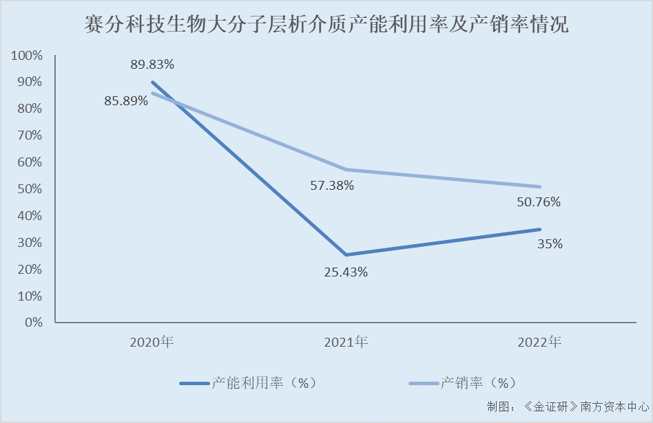 2020-2022年及2023年1-6月,赛分科技生物大分子层析介质产能利用率分别为89.83%、25.43%、35%、66.25%,产销率分别为85.89%、57.38%、50.76%、51.02%。