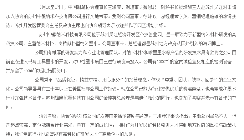 据中国制笔协会公开信息,2013年3月,中国制笔协会理事长王淑琴、副理事长魏淑君、副秘书长杨增耀三人赴苏州吴江对申请加入协会的中徽纳米进行实地考察,受到中徽纳米董事长徐炜政、总经理黄学英、营销经理施雄的热情接待。
