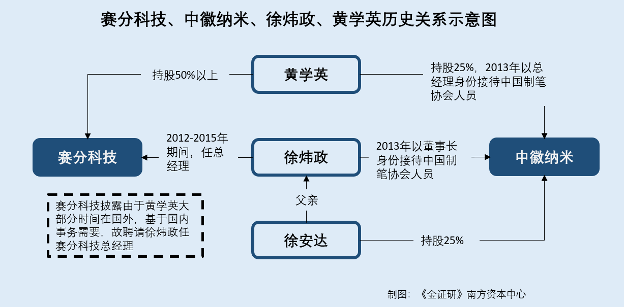 值得注意的是,在徐炜政担任赛分科技总经理期间,赛分科技实控人的黄学英却现身于徐炜政控制的中徽纳米任总经理。
