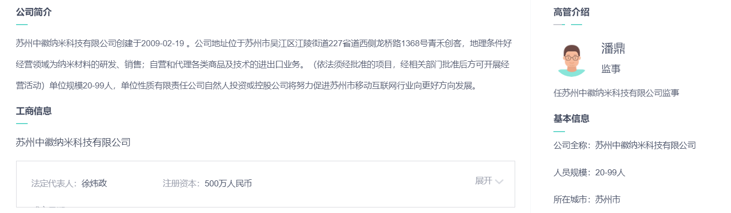 且上述公开信息介绍,中徽纳米位于苏州吴江经济开发区科技创业园,是一家从事新型纳米材料研发的高科技公司,主营纳米材料、高档颜料型纳米墨水。中微纳米的董事长、总经理都是地方政府从国外引入的海归博士。