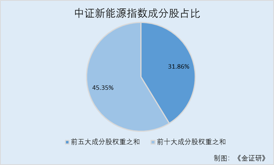 截至2025年11月17日,中证新能源指数前十成分股先后排序分别为宁德时代、阳光电源、隆基绿能、特变电工、亿纬锂能、华友钴业、赣锋锂业、中国核电、通威股份、天赐材料。在占比上前十成分股占比45.35%,其中前五占比就达到了31.86%。
