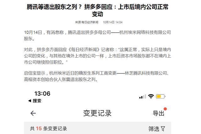 10月14日,相关媒体发现腾讯竟然已经退出了拼多多母公司股东之列。
