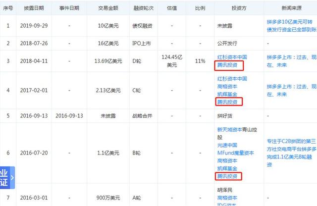 很多人都知道腾讯和京东是战略合作伙伴,但腾讯也早就参与了对拼多多的投资,根据公开资料,拼多多在上市前总共进行了4轮融资,而腾讯则参与了其中三轮融资,B轮、C轮、D轮。