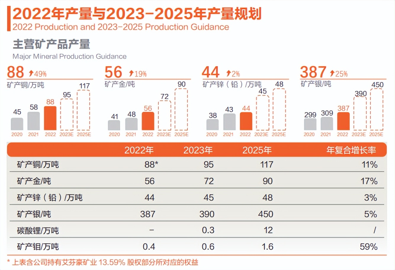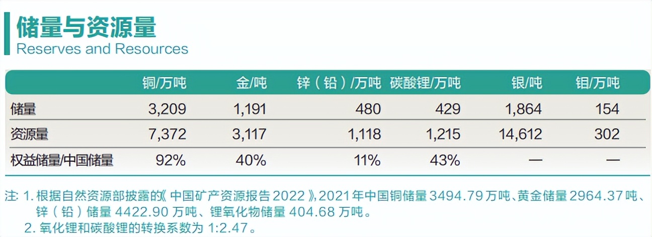 2022年,公司矿产铜87.7万吨,占国内总量的47%;矿产金56.4吨,占国内总量的19%;矿产锌40.2万吨,占国内总量的13%。