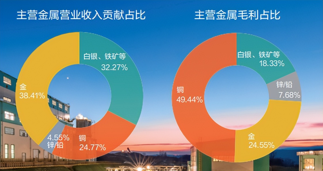 这些金属构成了紫金矿业重要的收入来源。其中,金、银、铜、锌,对公司收入贡献分别为38.41%、32.27%、24.77%、4.55%。