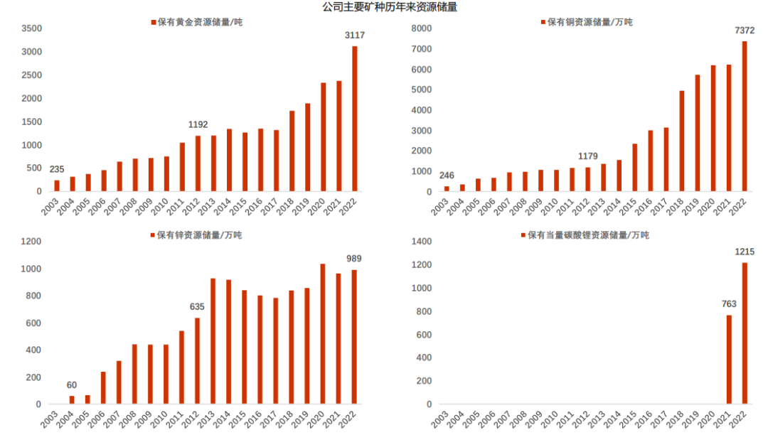 到2022年,紫金矿业的黄金资源储量已从2012年的1192吨提升至3117吨,铜资源储量从1179万吨提升至7372吨,锌资源储量从635万吨提升至989万吨。