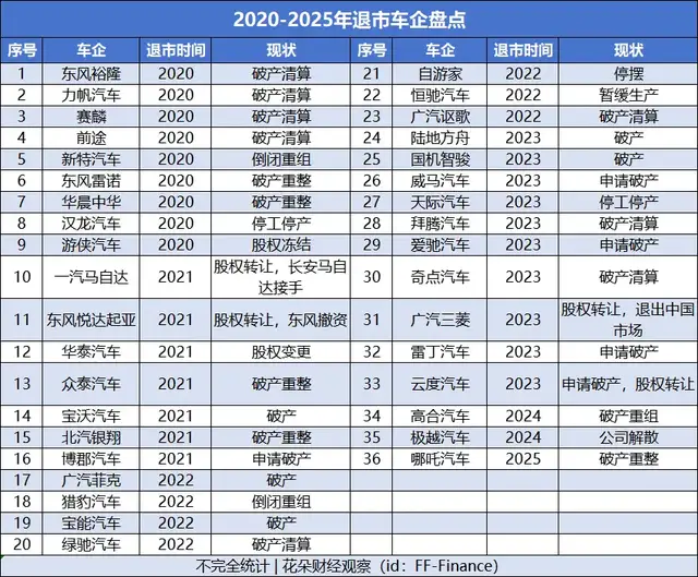 据花朵财经统计,2020—2025年8月,包括东风裕隆、力帆汽车、众泰汽车、宝沃汽车、恒驰汽车、威马汽车、天际汽车、爱驰汽车、高合汽车、哪吒汽车等在内,国内已有超30家车企因为破产清算、股份转让、破产重组、公司解散等原因退市。