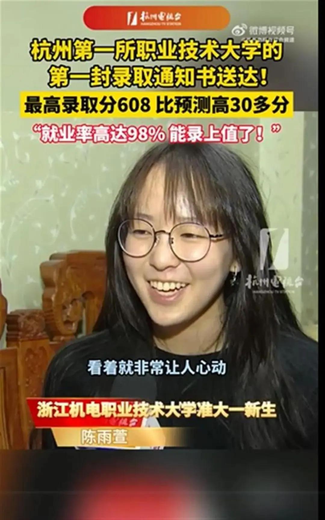 去年,浙江高考602分的陈同学放弃报名普通本科,选择浙江机电职业技术大学(简称“浙机电”)。在采访中,她的逻辑简单直白:“学校发布的就业率有98%,看着就非常让人心动,再加上毕业生去向有中铁局这种大企业,比较喜欢。”