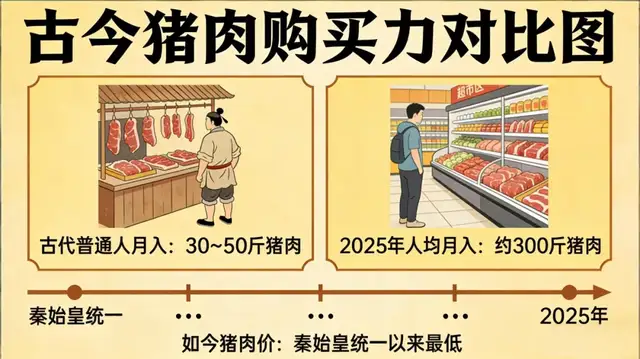 这不是危言耸听,有博主做了一个很有意思的统计,如果用“人均月收入能买多少斤猪肉”来做比较,在大多数朝代,普通人每月收入可以购买猪肉30斤到50斤左右,最便宜的时候也很难突破每月100斤。