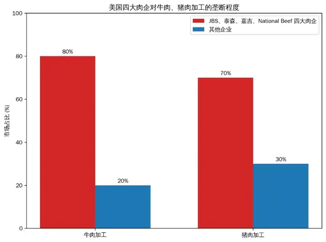 从上世纪80年代开始,美国花了整整30年,通过市场竞争把家庭农场清洗掉九成。到了今天,JBS、泰森、嘉吉、NationalBeef四大肉企牢牢控制了全美80%以上的牛肉加工和70%以上的猪肉加工。