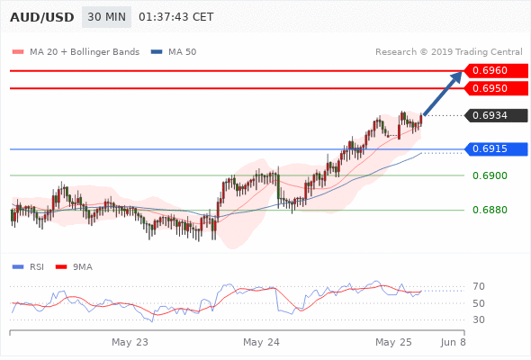 | 在 0.6915 之上,看涨,目标价位为 0.6950 ,然后为 0.6960 。 |