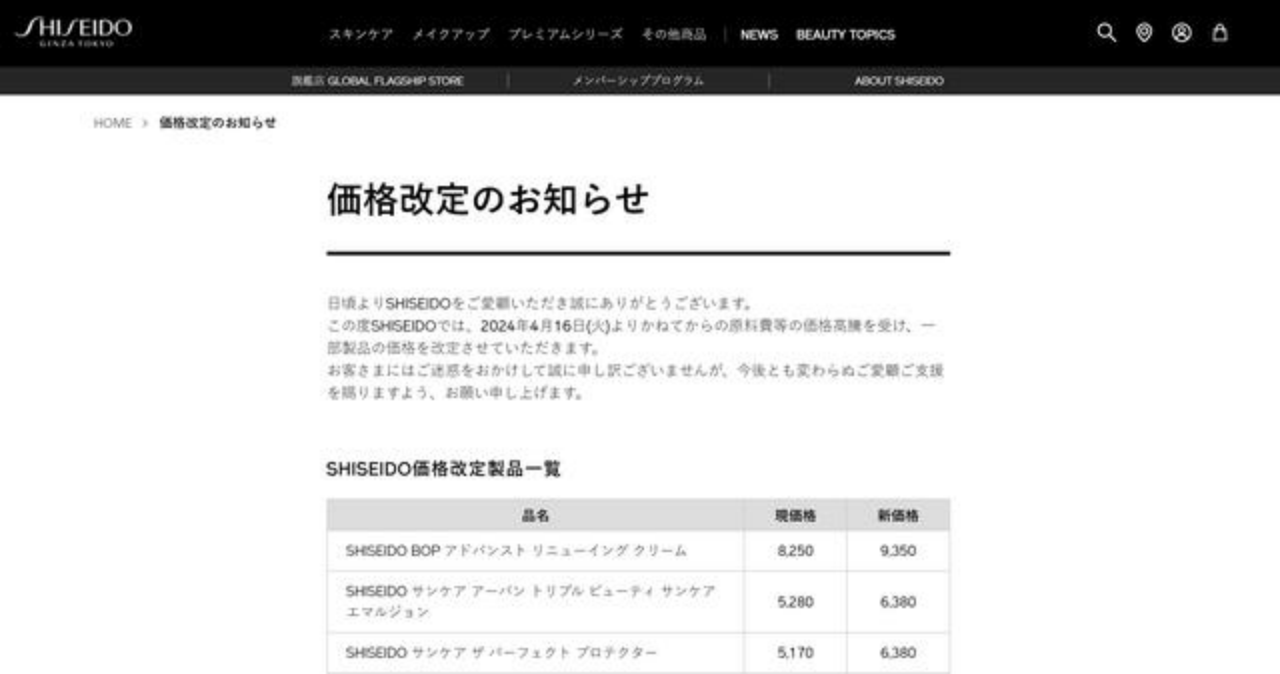 资生堂日本官网在今年2月份曾发布过价格调整通知:2024年4月16日开始,对部分产品的价格进行修订。其中一款洗面奶定价将由8250日元上涨到9350日元,一款精华液将由12650日元上涨到13750日元。