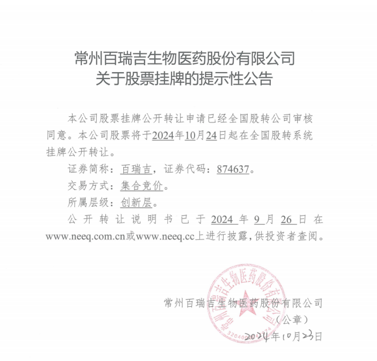 2024年10月23日,百瑞吉发布公告称,公司股票挂牌公开转让申请已通过,将于2024年10月24日起,在新三板创新层挂牌,证券代码874637。