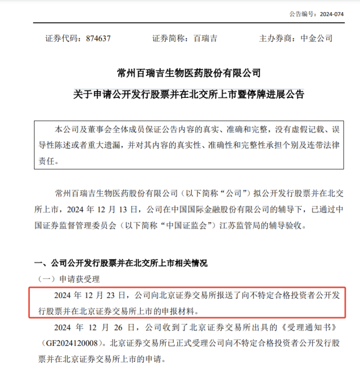 《关于申请公开发行股票并在北交所上市暨停牌进展公告》显示,2024年12月23日,百瑞吉向北京证券交易所报送了向不特定合格投资者公开发行股票并在北京证券交易所上市的申报材料。